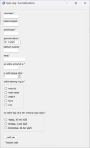 dit is een c# .net form voor het aanmelden voor een meeloopdag terwijl je op een open dag/avond bent, de aanmeldingen worden opgeslagen in een in een .CSV, die kan je opepen op het Admin scherm. voor meer uileg kijk de fotos hier onder: